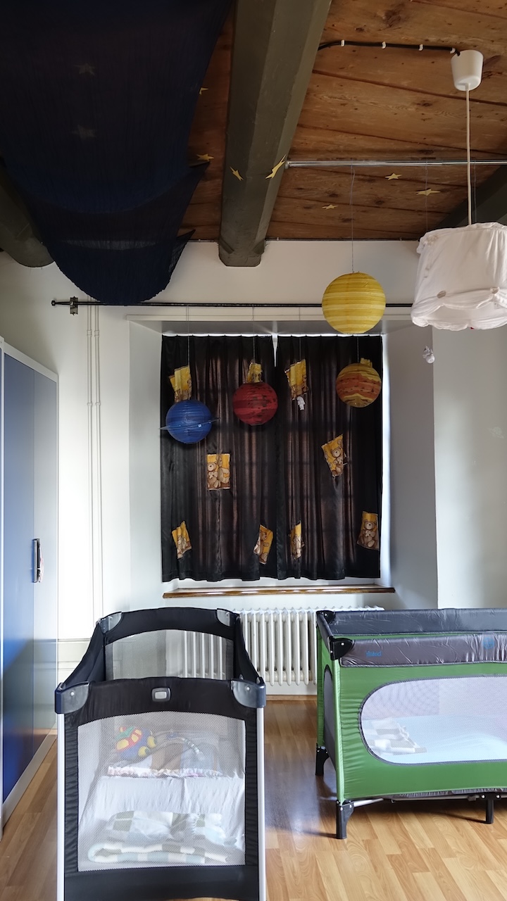 Das Schlaf- und Spielzimmer der Fledermäuse dient sowohl als tägliches Spielzimmer als auch als ruhiger Schlafraum. Dafür stehen gemütliche Matratzen und Babybetten zur Verfügung.