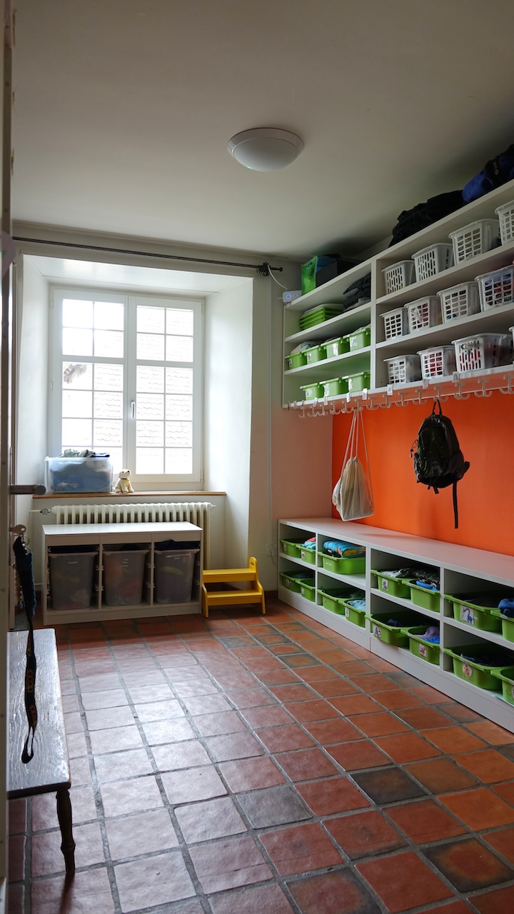 Die Garderobe bietet Platz für täglich bis zu 28 Kinder. In den persönlichen Boxen können Ersatzkleider, aber auch z.B. schöne erstellte Bastelarbeiten verstaut werden.